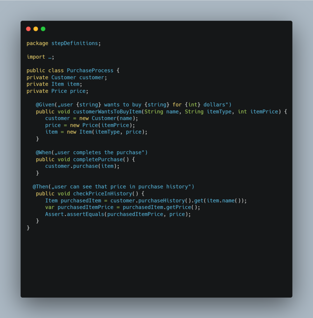 In the example above, the data is passed between step definitions (methods) through instance variables. This works because the methods are in the same class – PurchaseProcess, since instance variables are generally accessible only inside the same class that declares them.