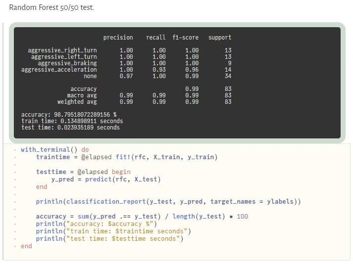 Julia can interface directly with external libraries written in C, C++, and Fortran without glue code. Interface with Python code using PyCall library works so well that you can seamlessly use almost all the benefits of great machine learning Python ecosystem in Julia project as if it were native code! For example, you can write: