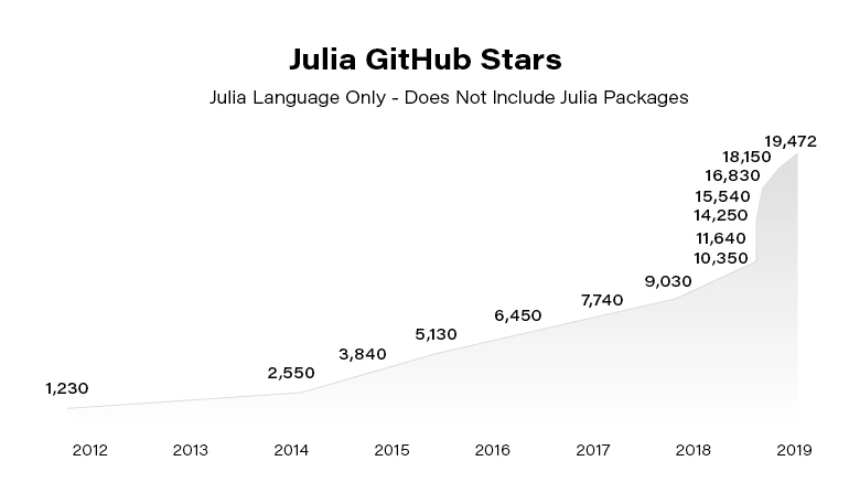 Julia becomes more and more popular. Since the 2012 launch, Julia has been downloaded over 25,000,000 times as of February 2021, up by 87% in a year.