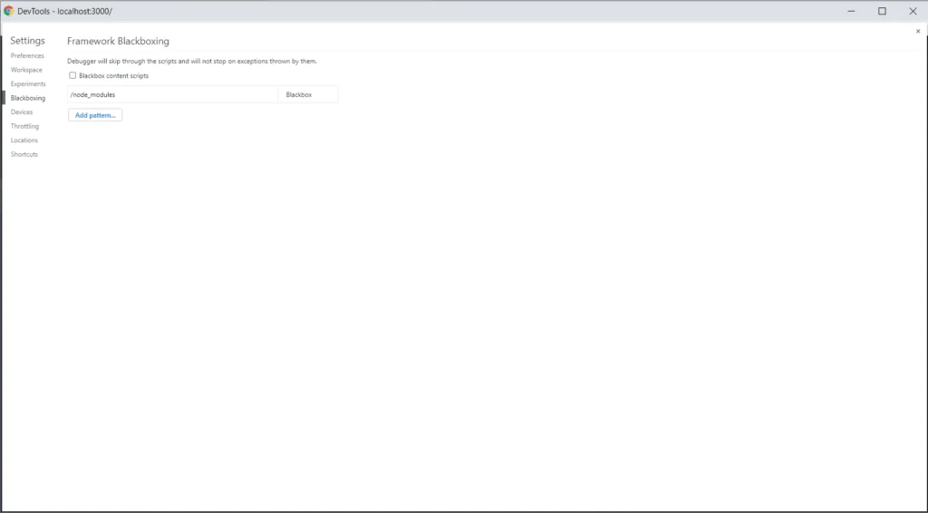 A more efficient method for debugging a web application is to use Chrome DevTools and Source Tab. Before we start debugging in the source tab, we need to add node_modules to black boxing. We add this rule so that when going through breakpoints it does not show us files from external packages, which makes debugging difficult. We need to open settings in Chrome → Blackboxing → Add patterns and then write there /node_modules .