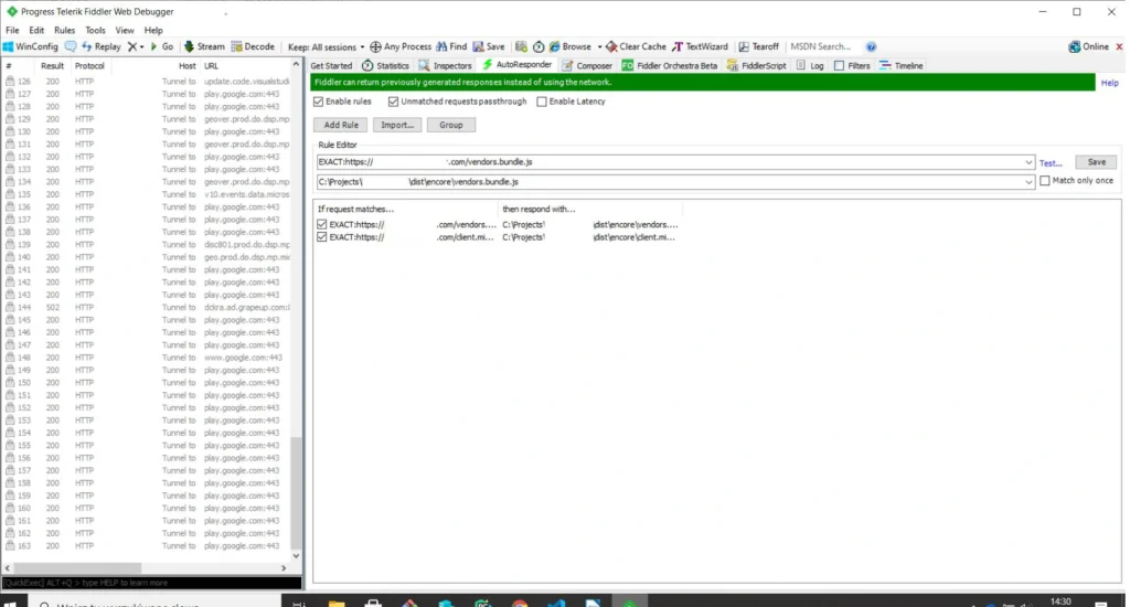 The last tool we would like to introduce is Fiddler . The tool was created to manage network traffic. It is extremely useful when we have some production bugs and we cannot copy the production data to a lower environment to debug locally. In such a situation, to have access to production data in the local environment, we set the traffic in the AutoResponder tab. When you open the page, instead of downloading the js file from the server, Fidler connects our locally built production file. Further debugging is done in the chrome dev tools source tab. Below is a screenshot with the setting to redirect traffic to the local file. The program also allows for mock endpoints.