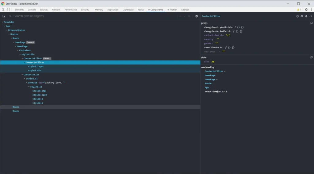 React Developer Tools are also helpful solutions. Such tools allow you to easily view the React tree structure in your project, the states, and props in the component. The Select an element in the page to inspect it function is powerful, especially when you don't know the whole project. It helps you find the component you need to update.