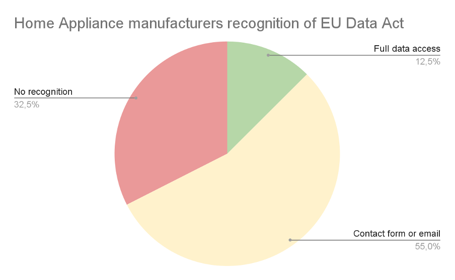 As of the 01.2026, most of the home appliance manufacturers (>85% of the 40manufacturers researched, responsible for 165 home appliance brands currently present on the European market) either provide the data access through a manual process (ticket, contact form, email, chatbot) or does not recognize the need of sharing data with owner at all.