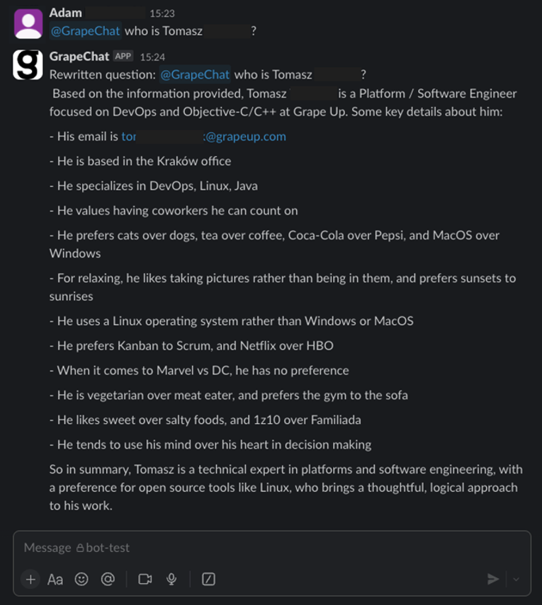 We do use a REST field filter like the one offered by the native MS solution, too, but in our case, we do the permission-aware search first. So, if there are several people in the Slack conversation and one of them mentions GrapeChat, the bot uses his permission in the first place and then, additionally, filters results not to expose a document to other channel members if they are not allowed to see it. In other words, the calling user can restrict search results according to teammates but is not able to extend the results above her/his permissions.
