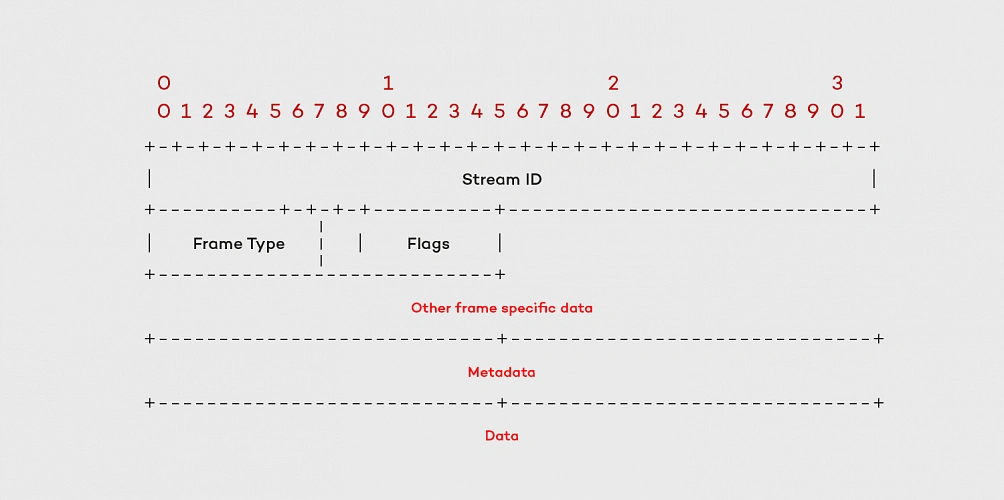 Interaction in RSocket is broken down into frames. Each frame consists of a frame header which contains the stream id, frame type definition and other data specific to the frame type. The frame header is followed by meta-data and payload – these parts carry data specified by the user.