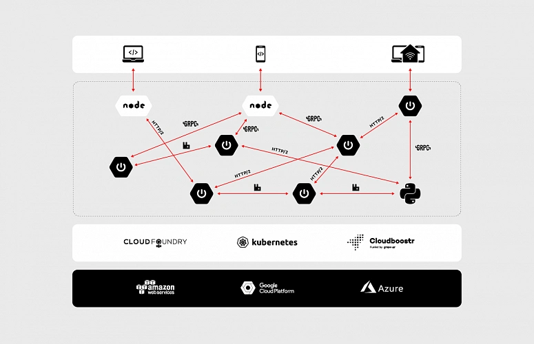 To be IaaS provider agnostic and improve developer experience the applications are running on top of PaaS. We have a wide range of possibilities here: Cloud Foundry, Kubernetes or both combined in Cloudboostr are suitable. In terms of communication between services, the design is simple. Each component exposes plain REST APIs – as shown in the diagram below.
