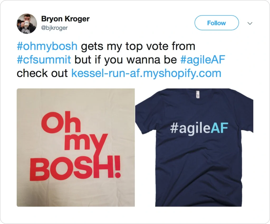 During his presentation, Capitan Byron Kroger (@bjkroger) explained in depth how they dealt not only with difficulties but also with all paperwork which was slowing them down at that time. And he proudly sports our Oh My BOSH t-shirt which gives him additional points