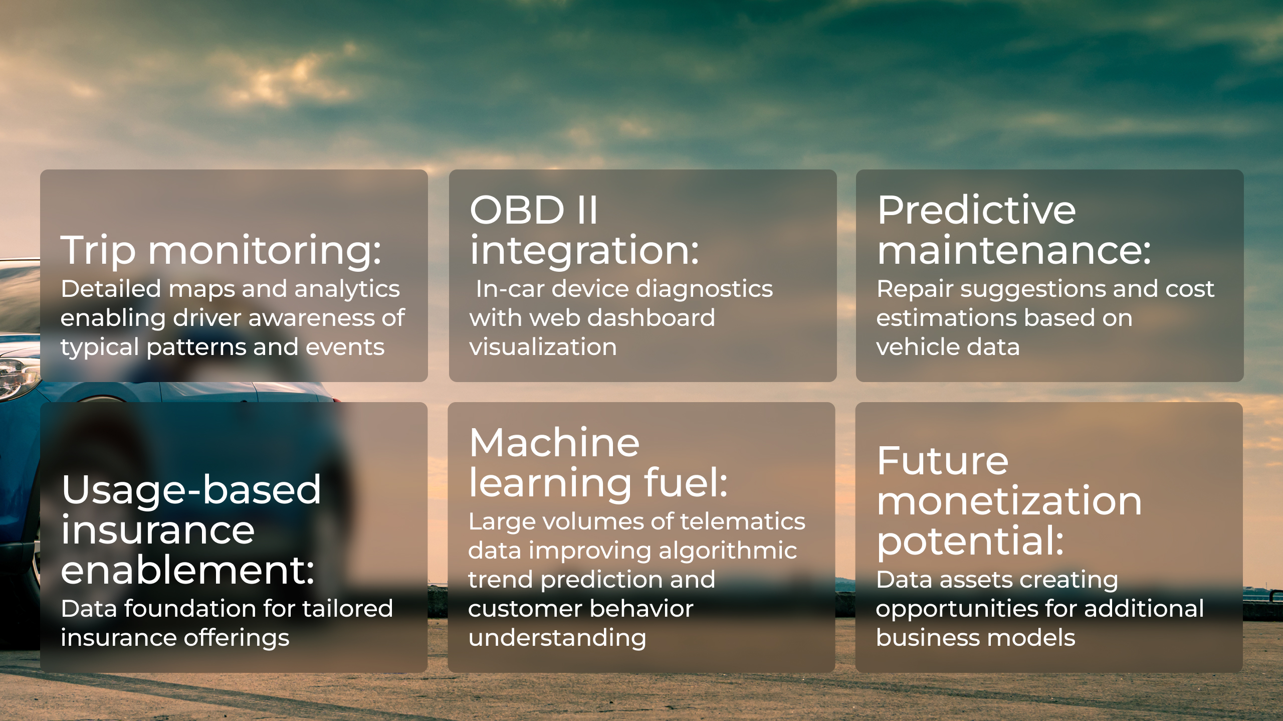 This data enables multiple business opportunities. First, the insurer can deliver tailored, usage-based insurance offerings based on actual driving behavior rather than demographic assumptions. Second, large volumes of data help the company's ML algorithms better forecast trends and more precisely understand customer behaviors. Third, the data provides opportunities for future monetization as new use cases emerge.