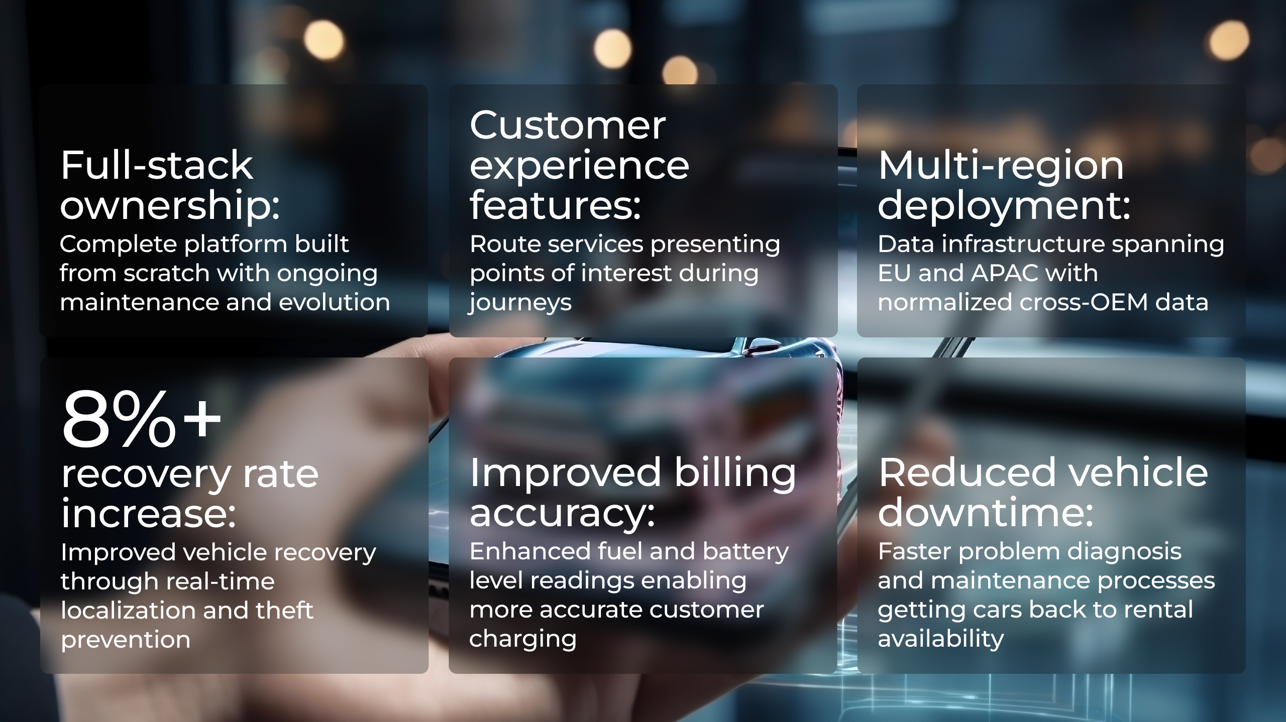 The platform delivered measurable results: at least 8% increase in recovery rates, improved billing accuracy, and reduced vehicle downtime. But the deeper transformation was operational - fleet managers now make decisions based on live vehicle data rather than historical reports. Customer experience improved through services like route optimization with points of interest.