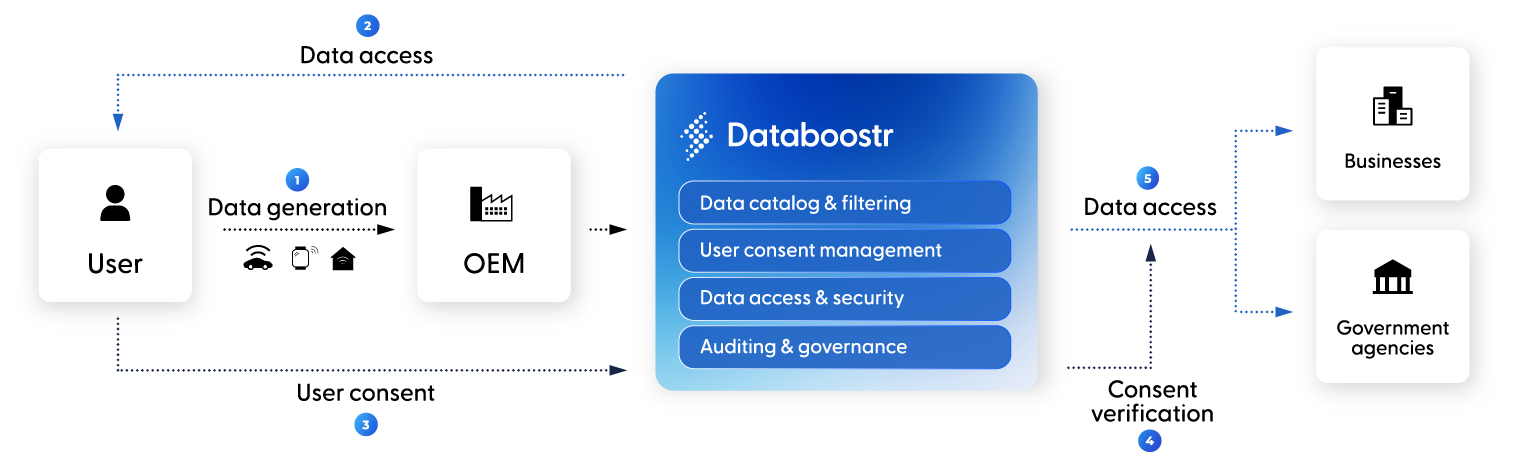 Databoostr enables organizations to meet Data Act obligations by managing user-initiated and third-party data requests, enforcing consent and authorization, and providing secure, governed access to product-generated data across the entire ecosystem.