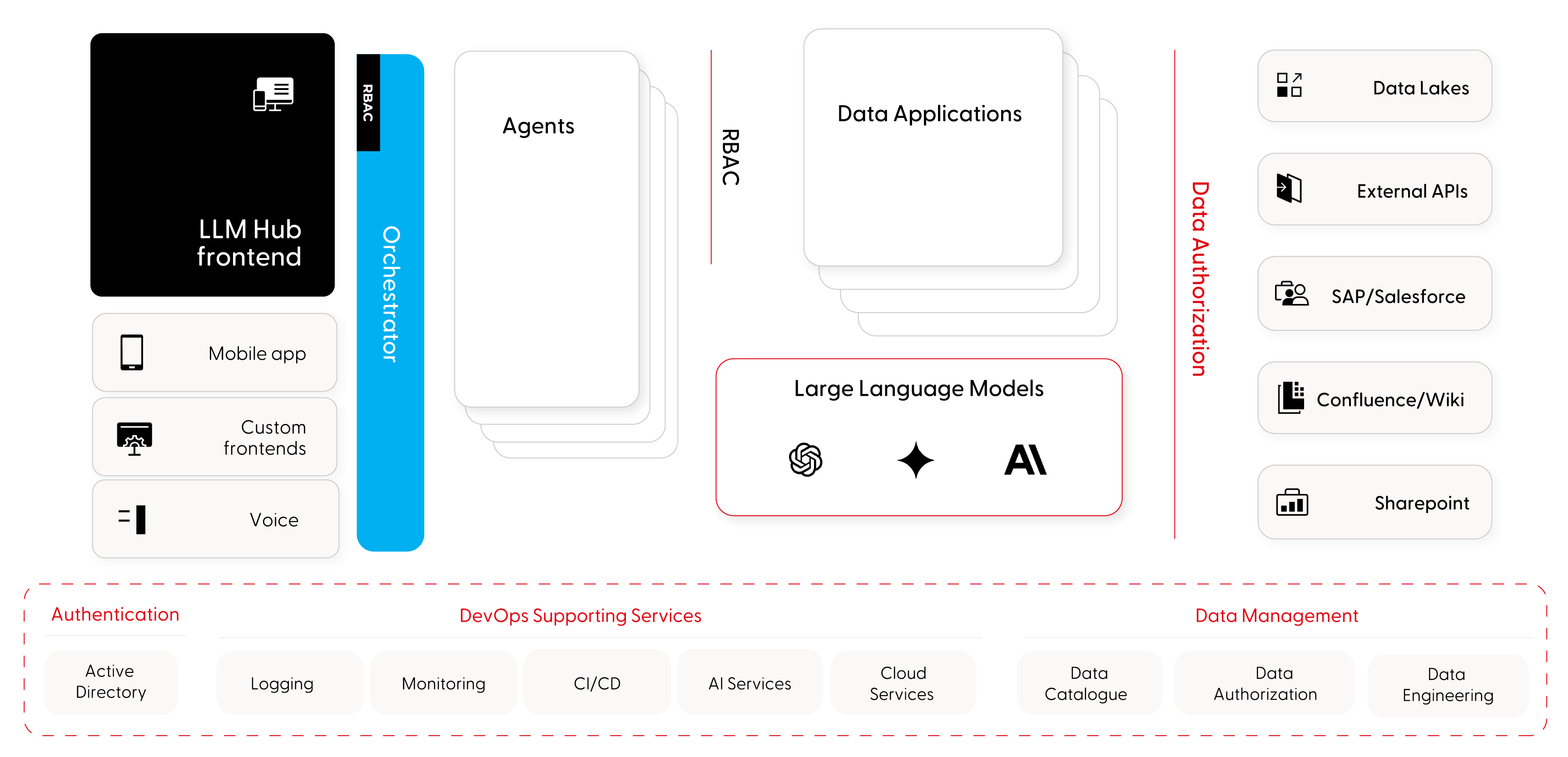 We design and build enterprise AI platforms with plug-in architecture that integrates new agents, data sources, and LLM models into a governed, scalable system. The platform connects to your existing enterprise infrastructure - from data warehouses and CRMs to identity management and CI/CD pipelines.