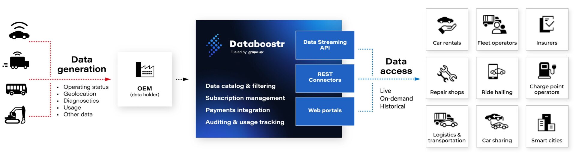 Lack of experience and access to potential business partners can be a serious barrier for OEMs when planning telematics data monetization. Grape Up’s automotive industry expertise and market relationships accelerate monetization launch.